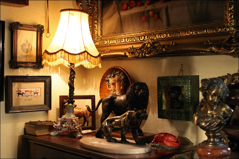 Stevengraph selyemkép, Fischer porcelán lámpa, bronz nõi büszt és oroszlán, Kiss Roóz kerámiák